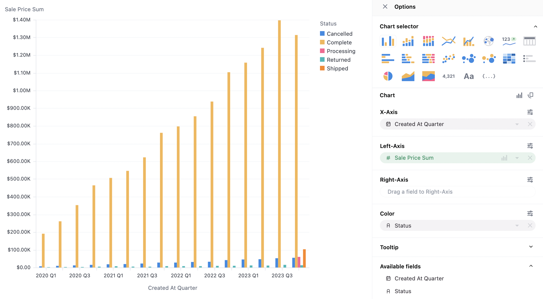 - Axes are set to ordinal with bars (vs temporal with line, scatter, and area charts). This means each bar will be labeled independently (not a continuous axis), the axes are not intelligent about time, and values that are not in the set will not be plotted. To fill missing rows, the data must be adjusted in the table - more here
