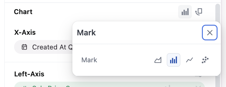 The mark selector at the top of the configuration sets the global chart configuration (configuration across all series). Note that each series can be set independently to bar, line, scatter, area independently under their y-axis controls