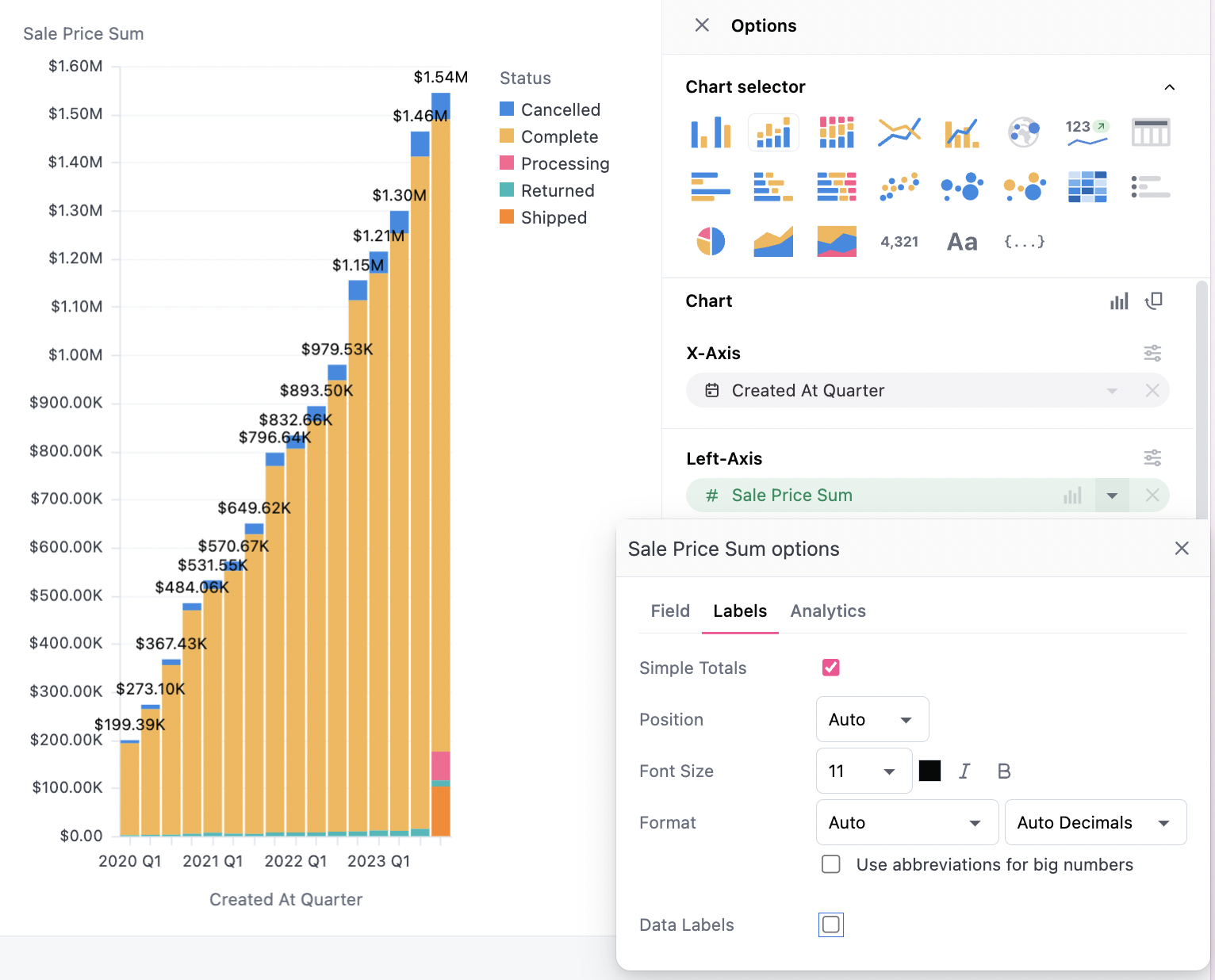 For color-by stacked charts, totals can be labeled under the y-axis series configuration (Series > Labels > Simple Totals). Right now totals are not available for multiple-measure stacks. Additional configuration is provided for styling and value formatting of the labels: