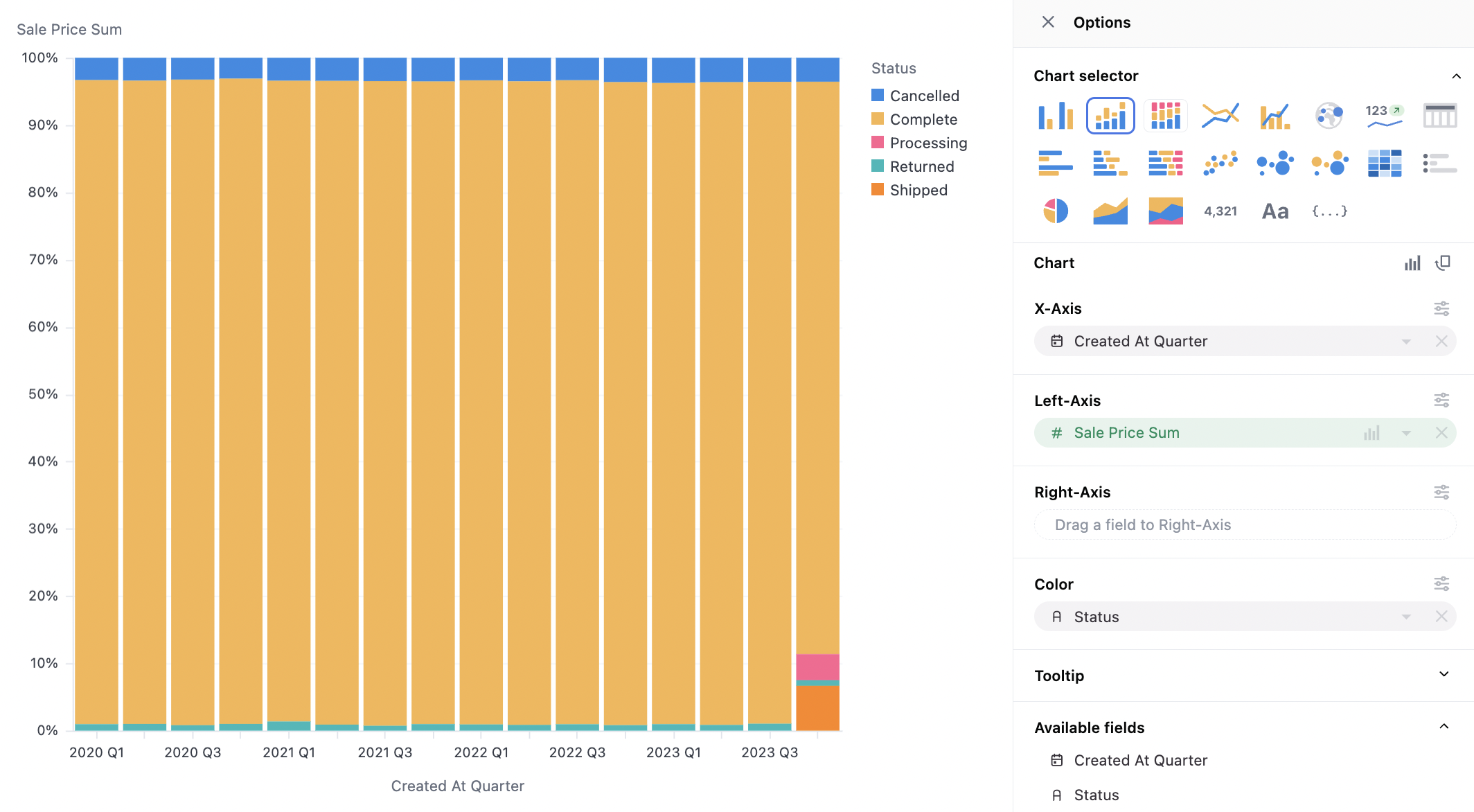 - Stack %: Series rebased to 100% across each x-axis value