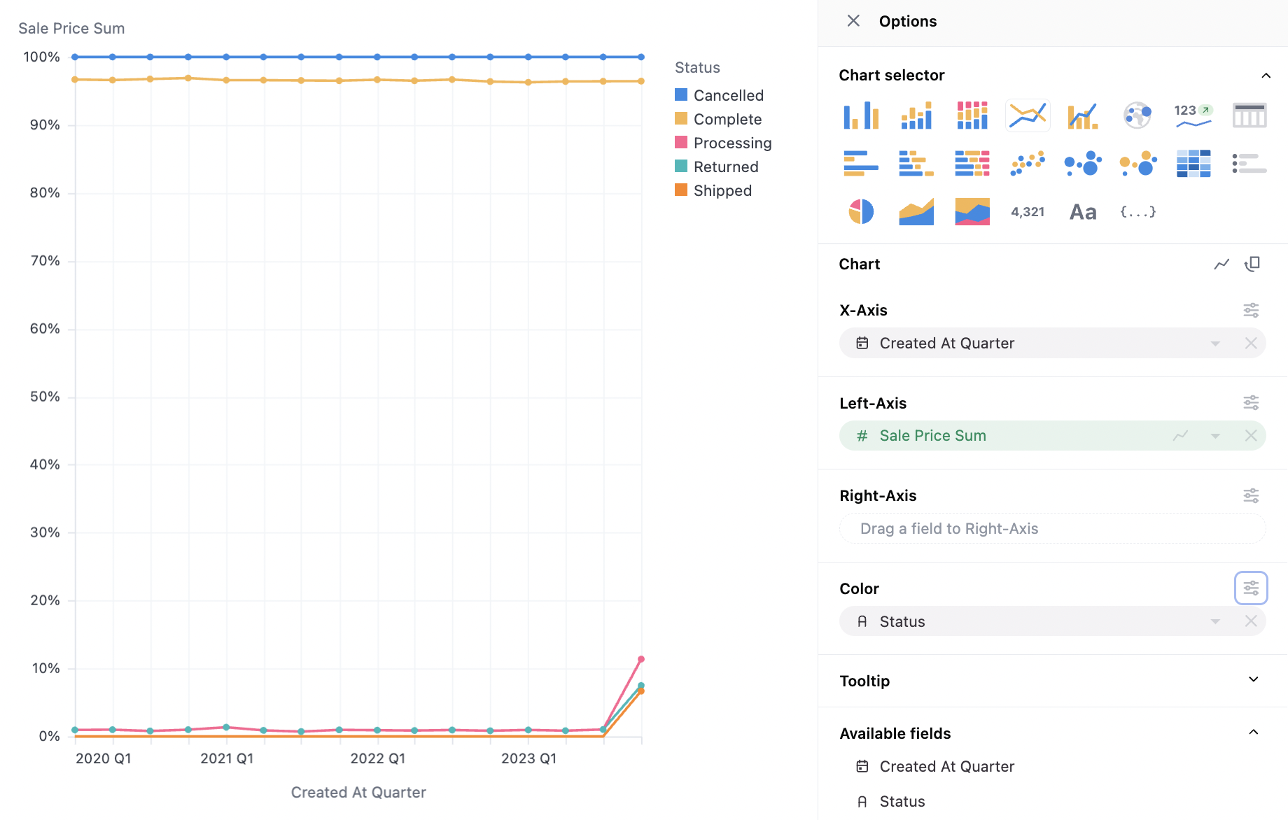 - Stack %: Series rebased to 100% across each x-axis value