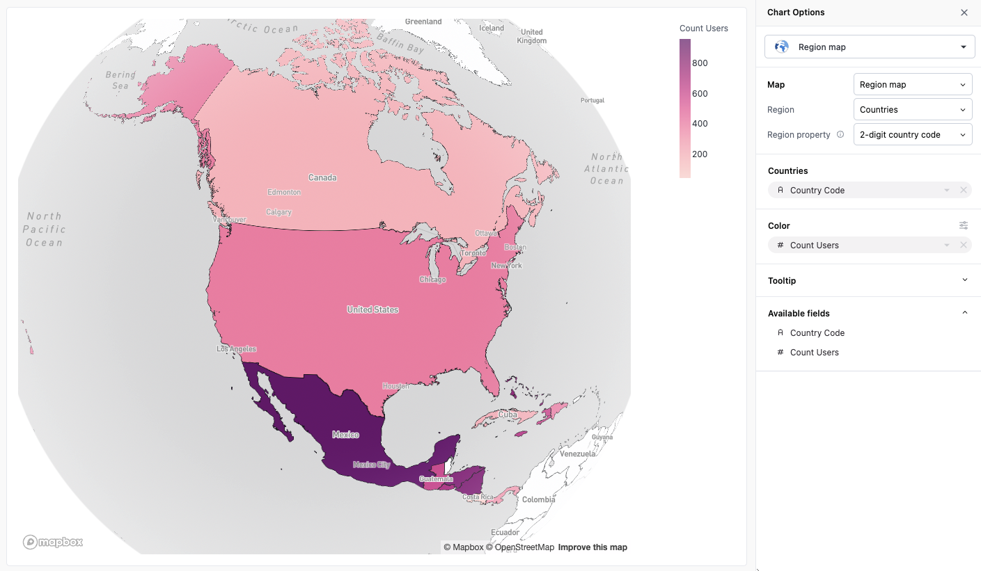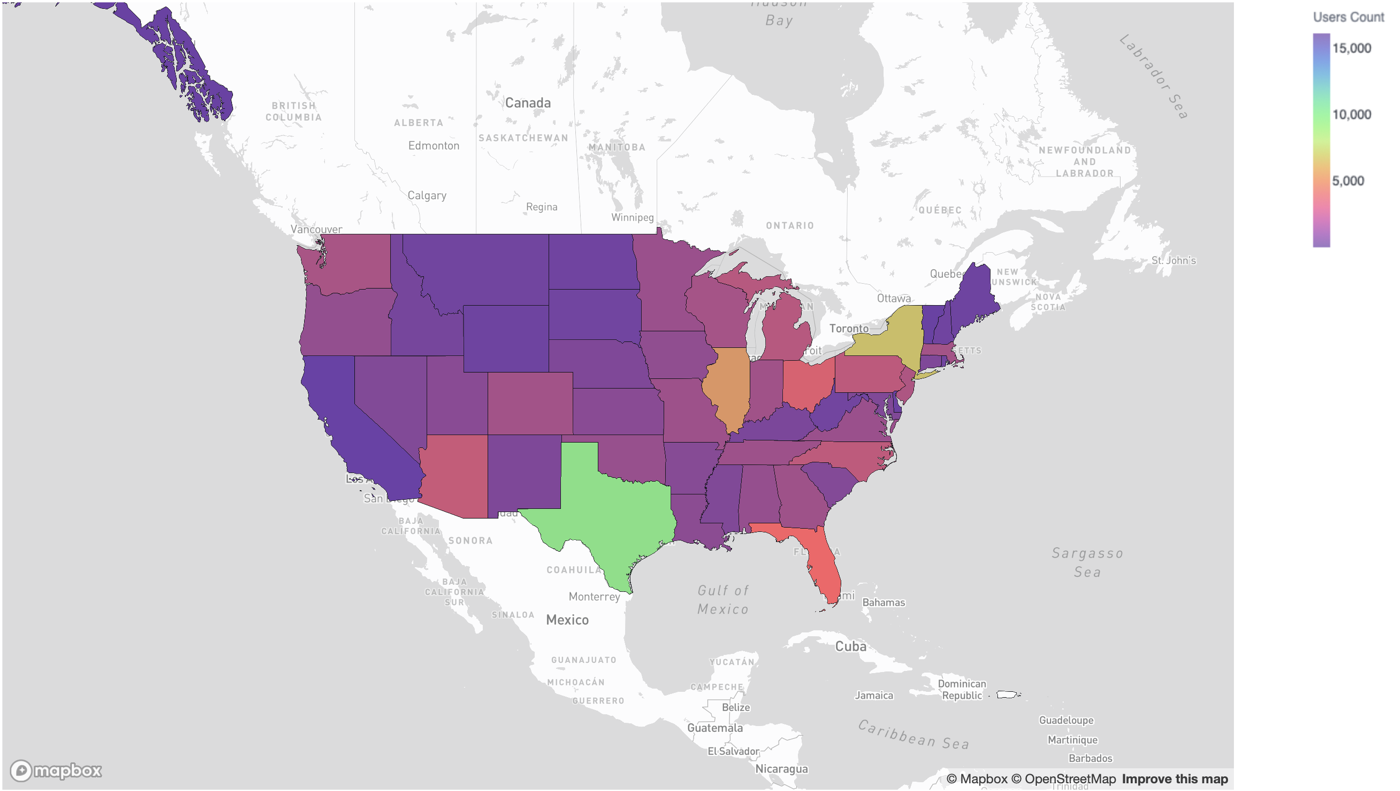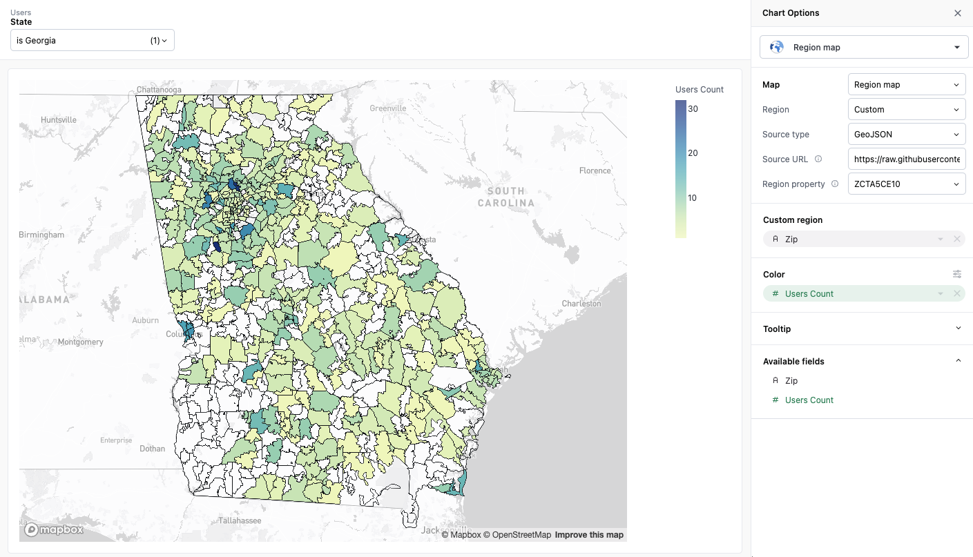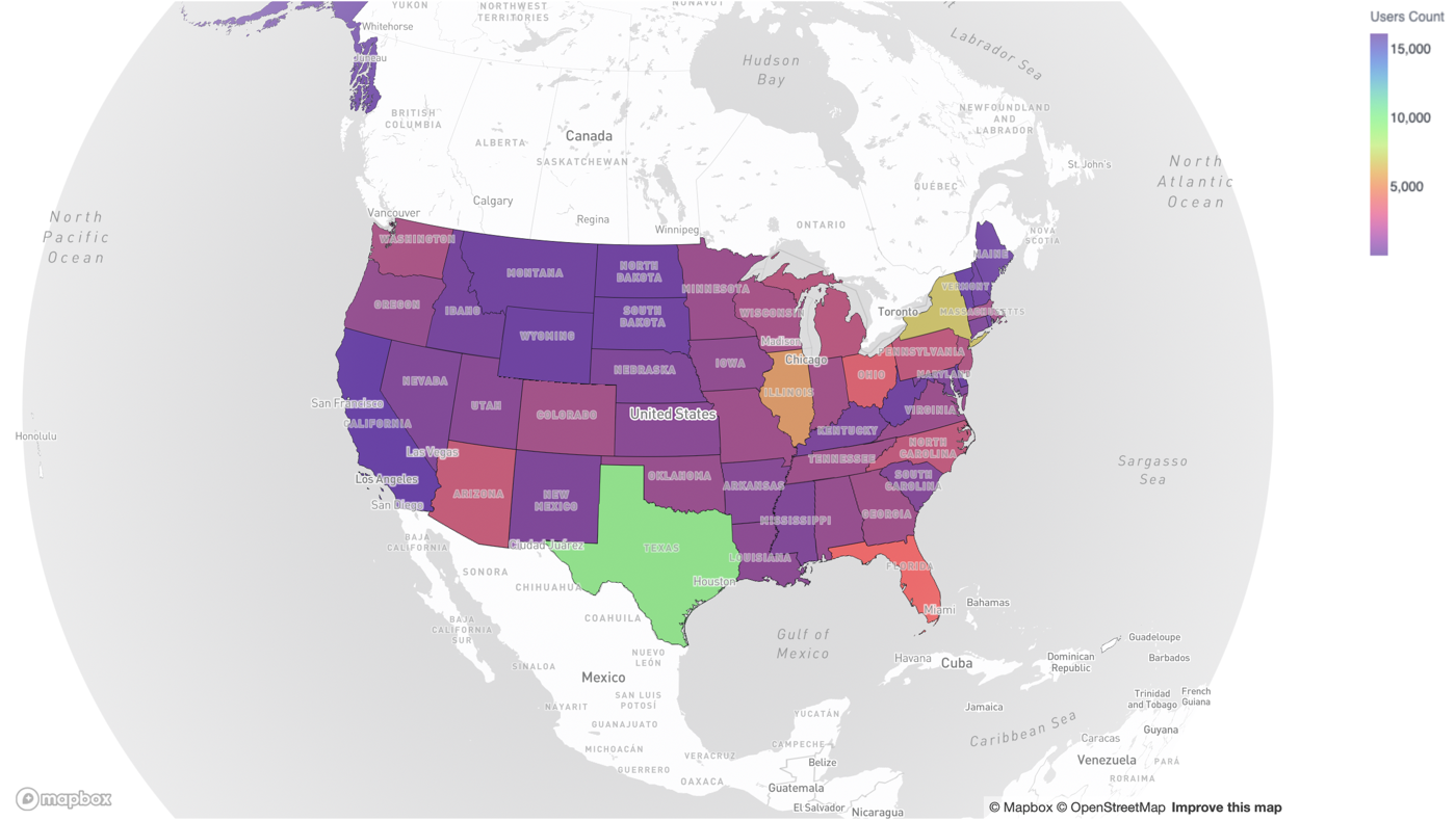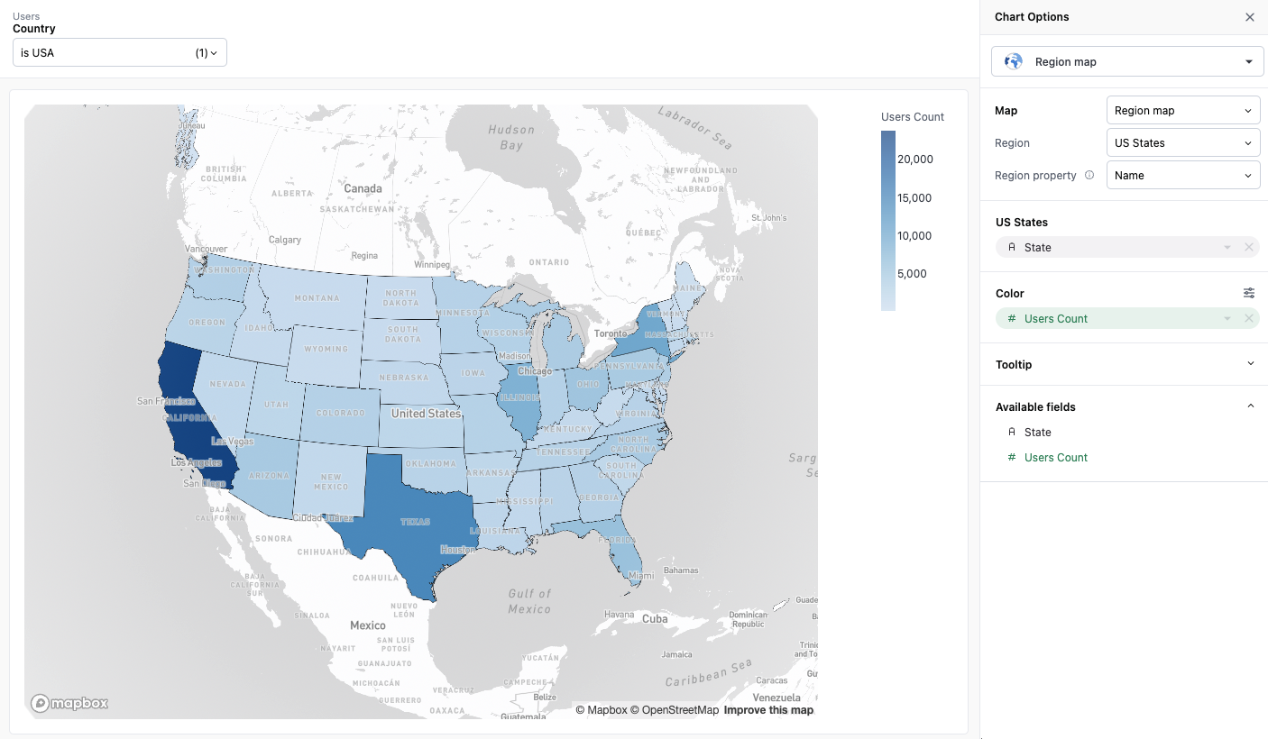 Data with region-based location information can be visualized as a region map. Omni offers region-based mappings for countries and US states out of the box, and offers a custom region option for greater flexibility.