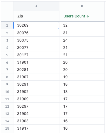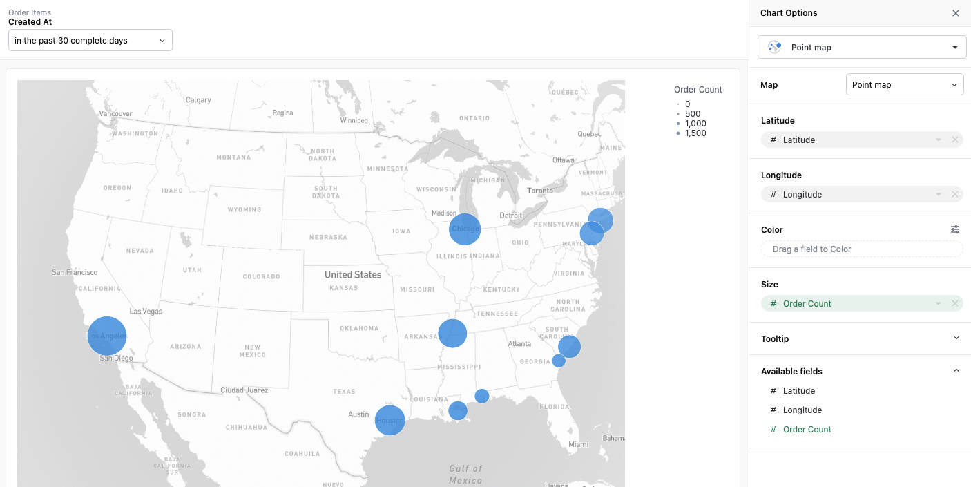 Data with latitude-longitude pairs can be visualized as a point map. Points can be sized and colored by additional properties in the dataset.