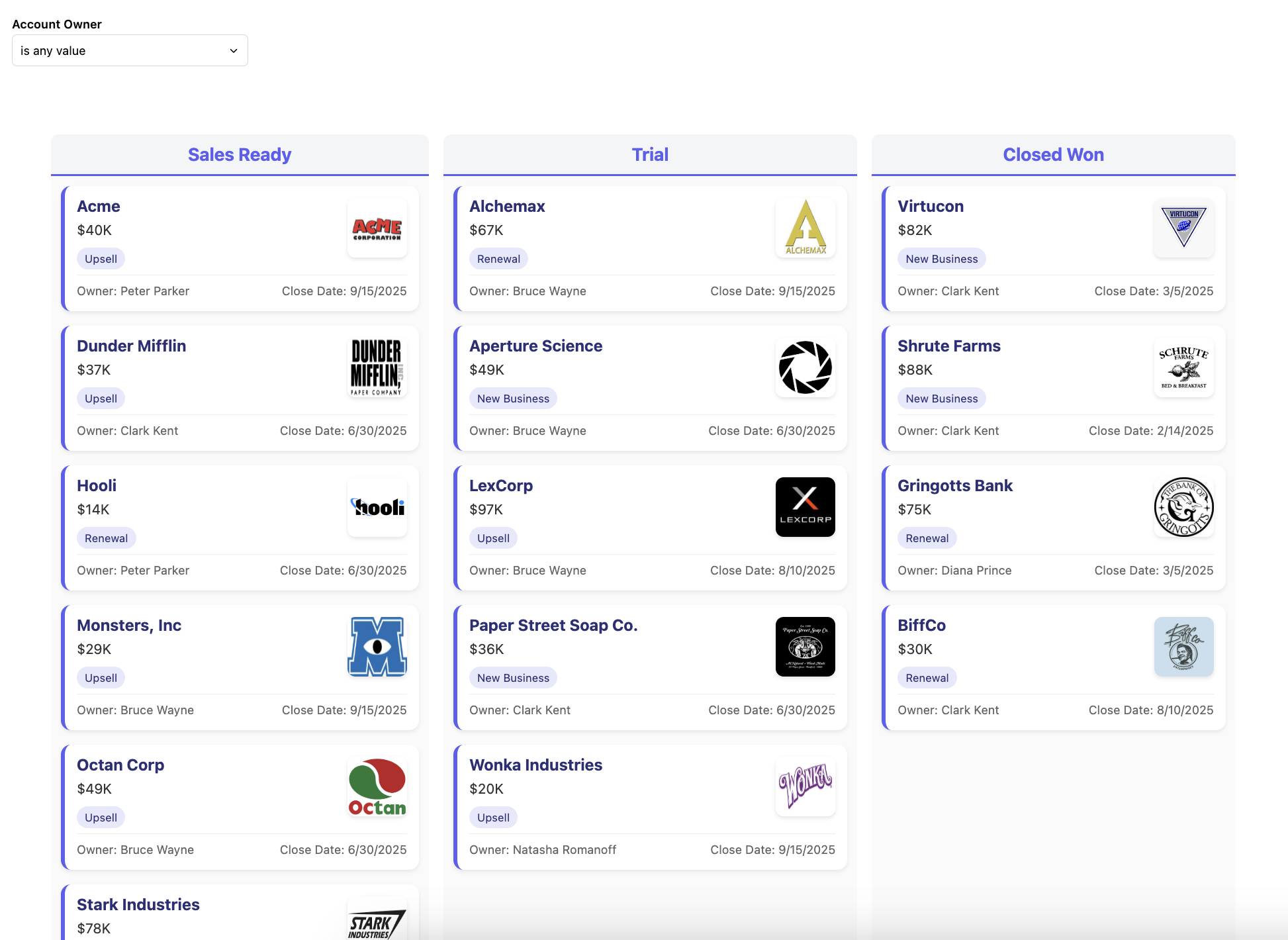 The code for this example can be used in the Markdown visualization to create a Kanban-style project board. In this example, each card on the board represents a company in the dataset.
