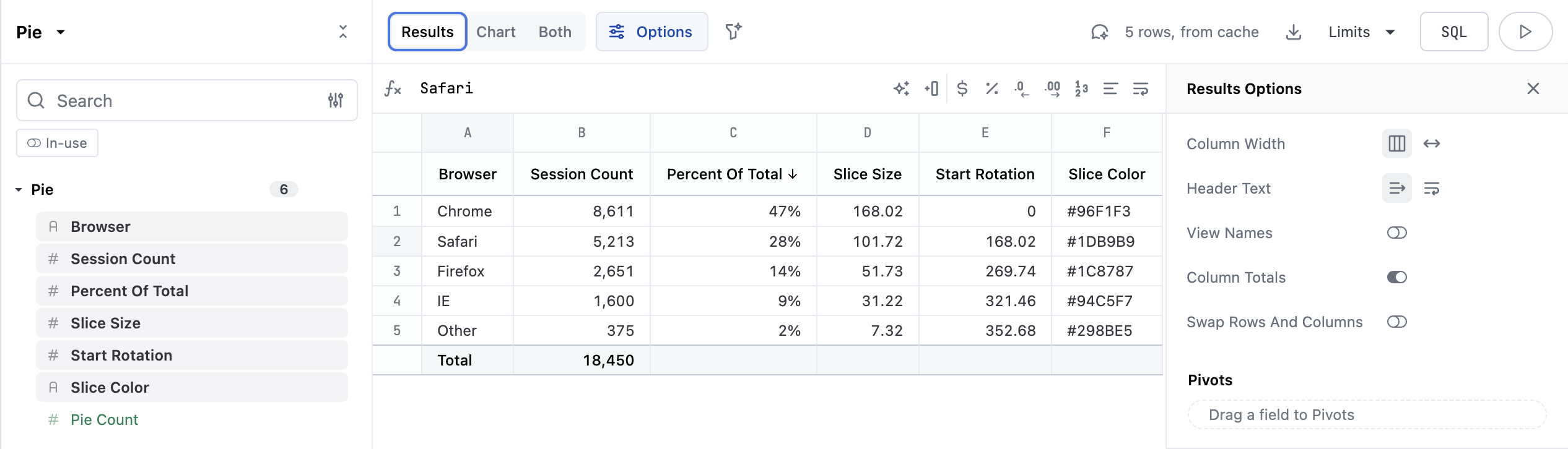 Pie Countshould be selected when you're finished. - On the Results tab, open the Options panel and enable column totals.