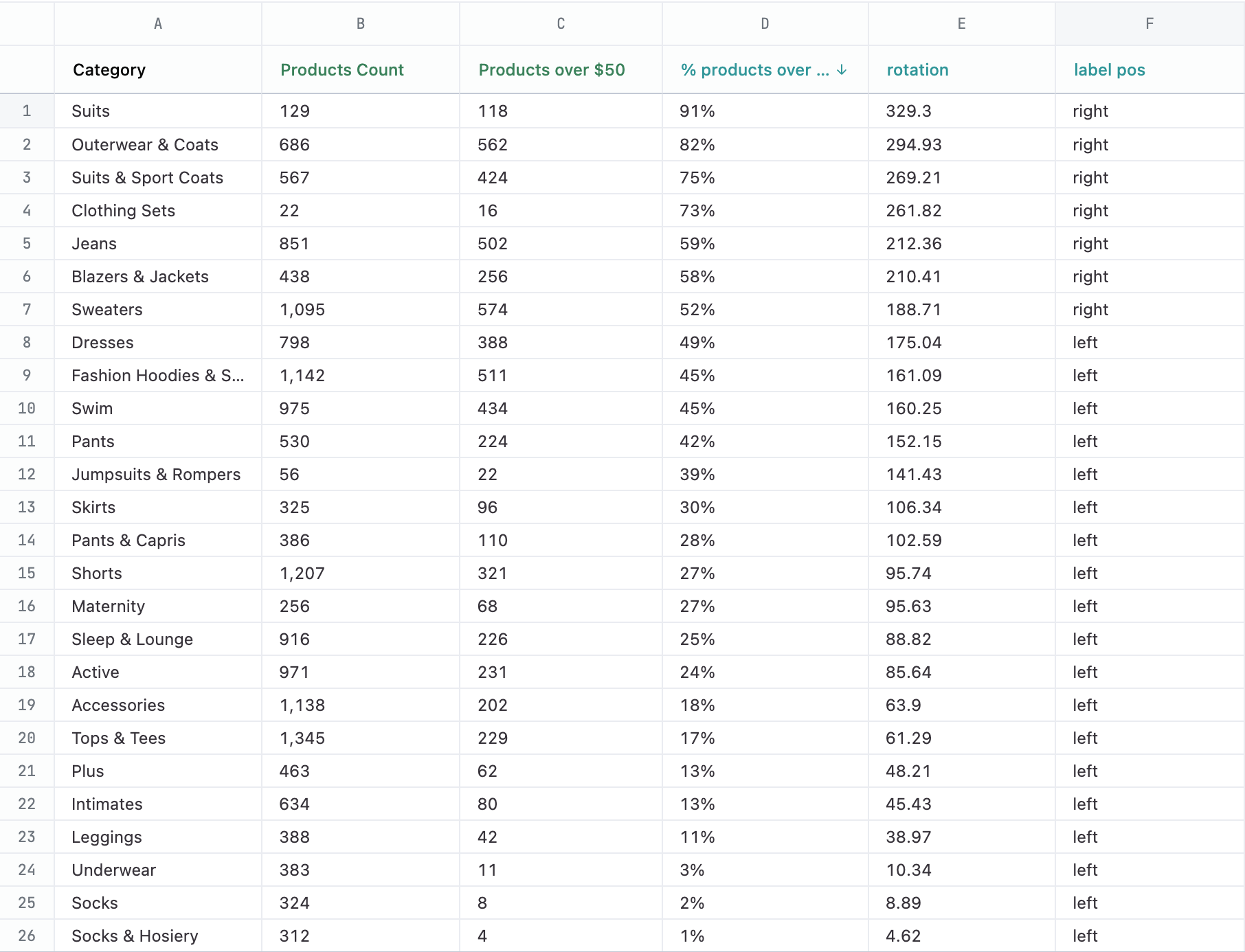 | C | Products over $50 | query field | numerator for % calculation |