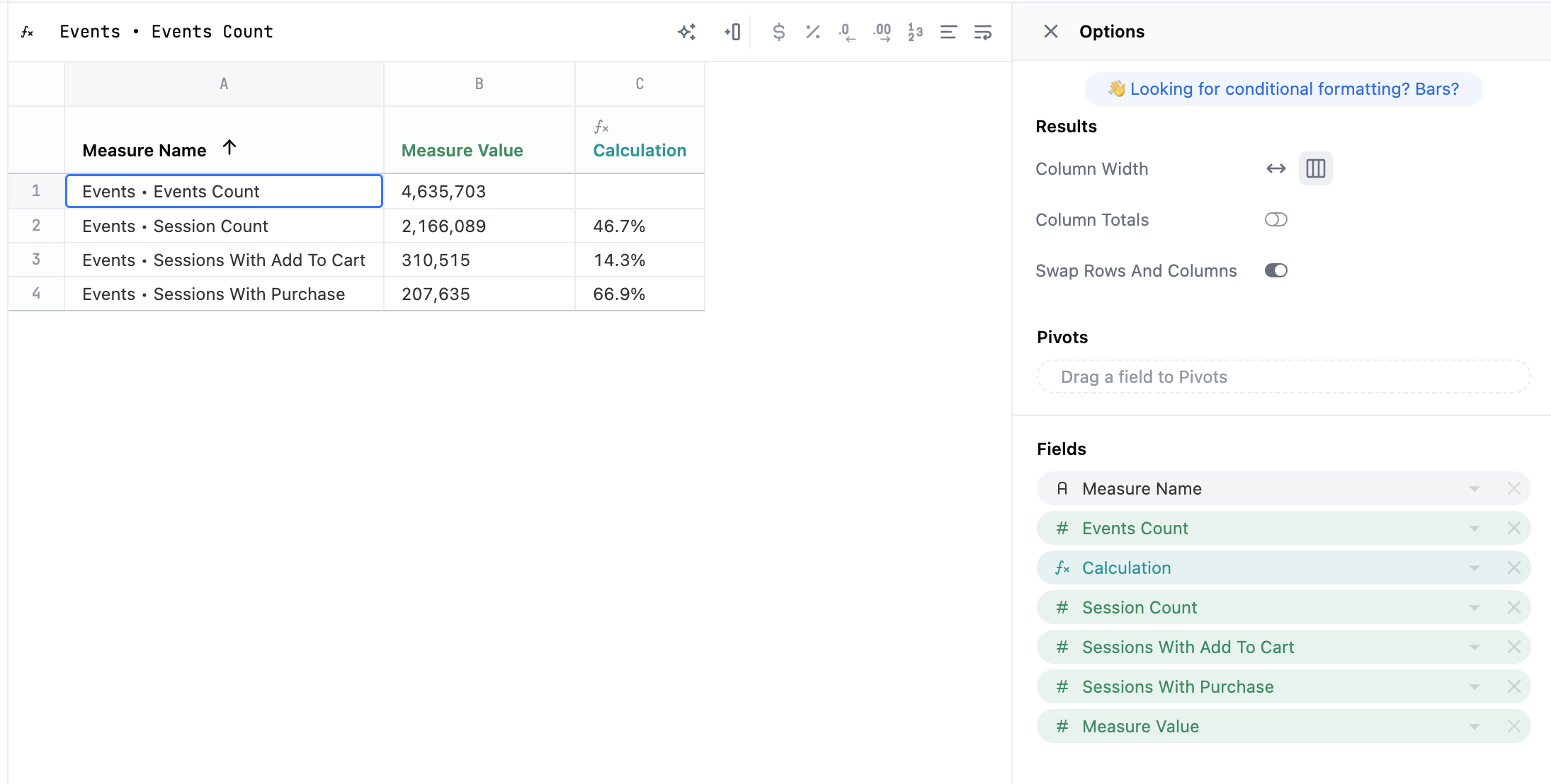 This visualization is built on having multiple measures which are then swapped rows and columns, with a calculation built to get stage by stage conversion metrics. For example, in cell C2, enter the formula =B2/B1.