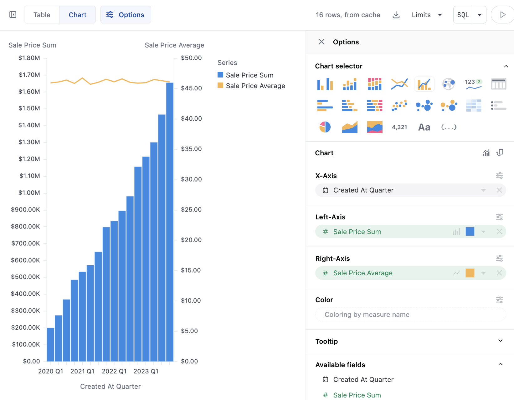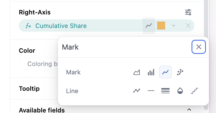 The overall mark selector at the top of the configuration sets the global chart configuration (configuration across all series). Note that each series can be set independently to bar, line, scatter, area independently under their y-axis controls. To build a mixed chart, either select the bar/line accelerator, or set a base chart type and adjust the other series using the icon on the y-axis: