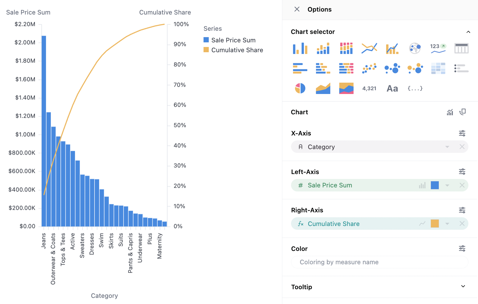 Pareto Chart: This is done by simply adding a % of total, and then a running total over the % of total.