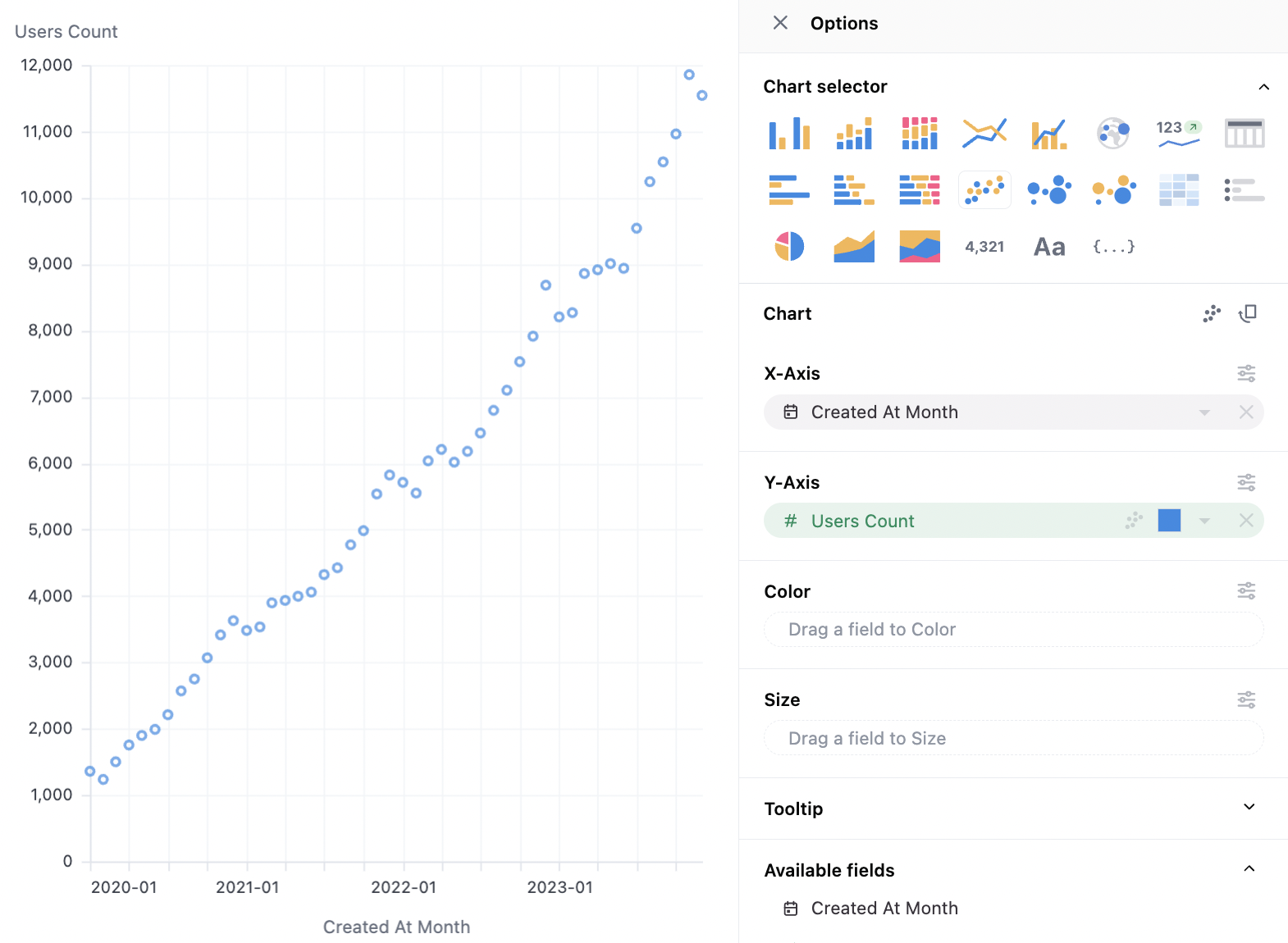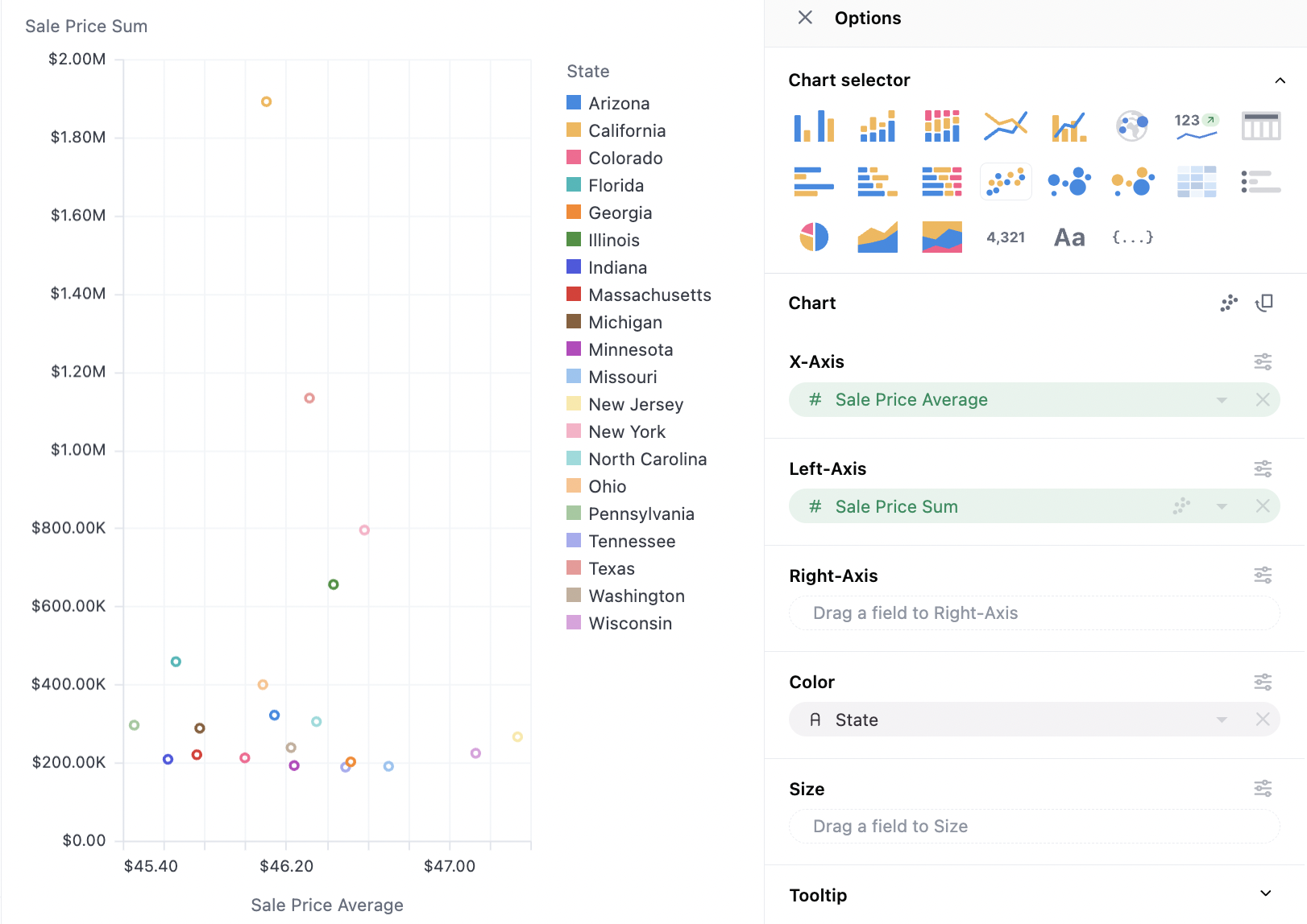 Scatterplots can work with pivoted or unpivoted data. To layer in color or size, simply drag a series onto the optional facets. Note that color will behave differently for numerics (where color will be plotted as a continuous variable) or strings (where color is plotted as an ordinal). For numerics, the behavior can be toggled under color > type.
