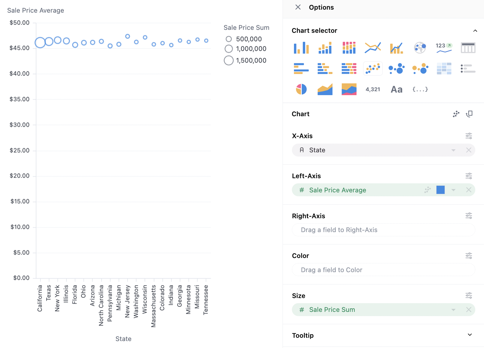 Tooltip control is another frequent need for scatterplots. To configure which dimensions or measures are in the tooltip, they can be dragged to the tooltip section, and are shown in the order listed.