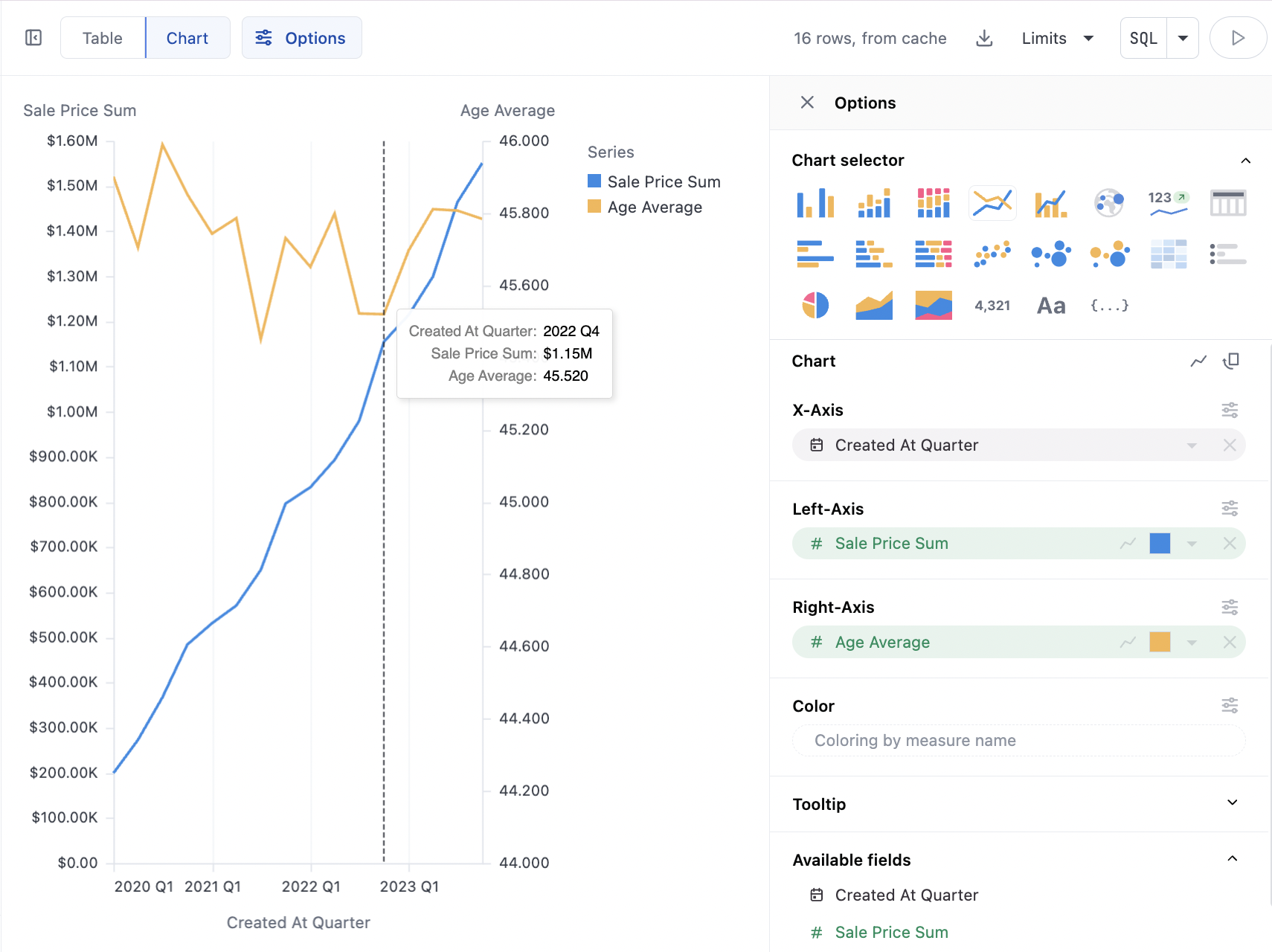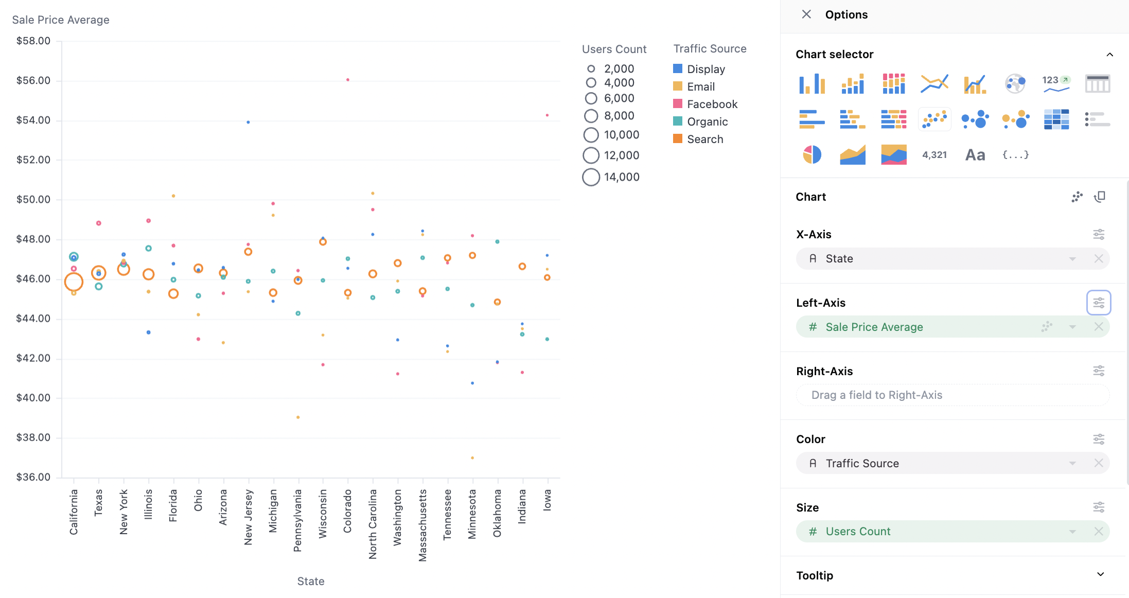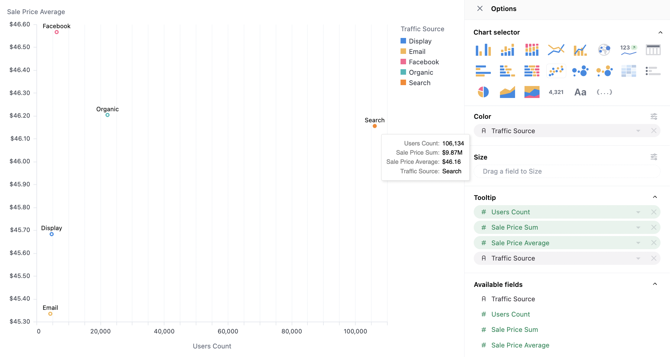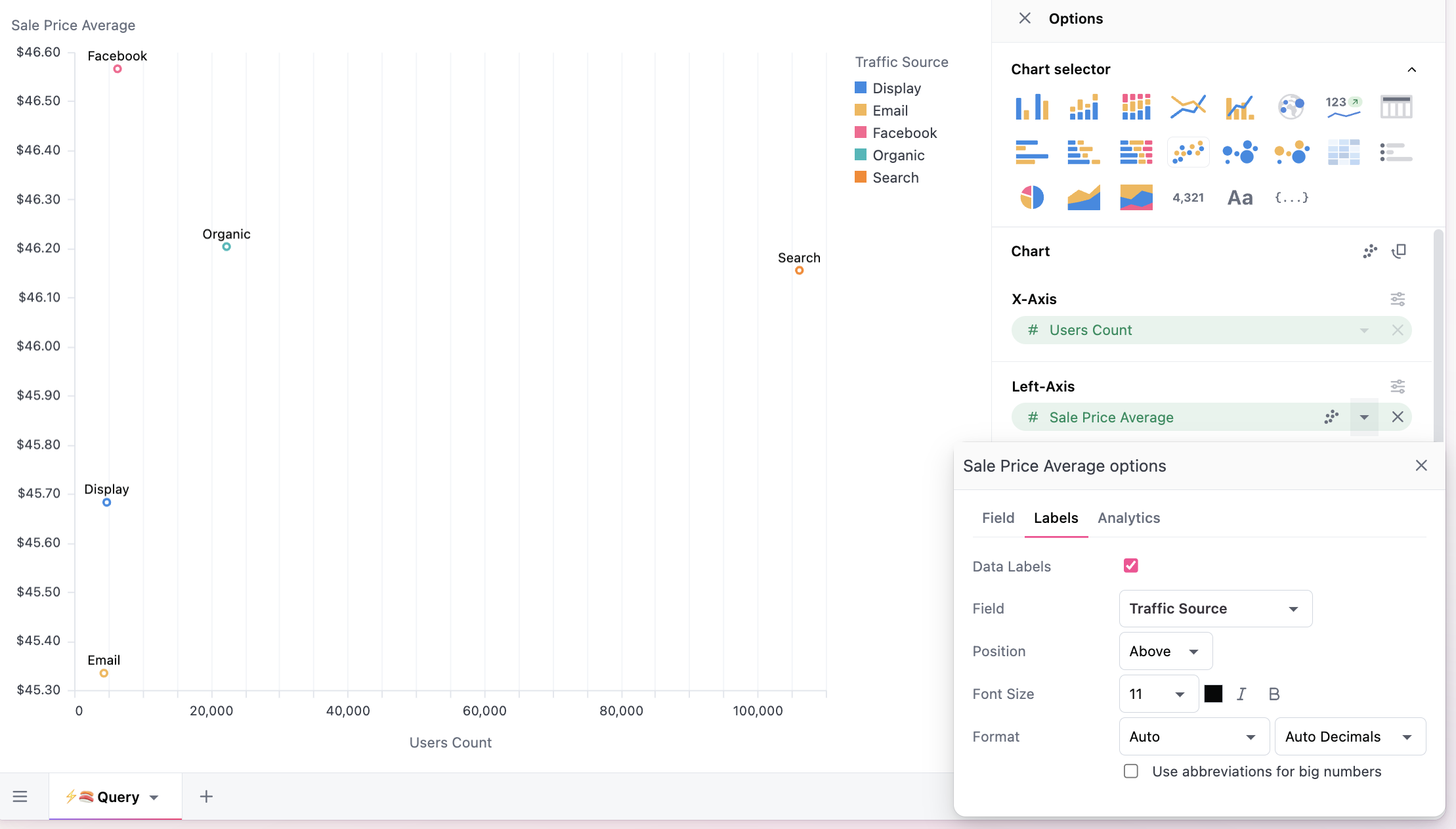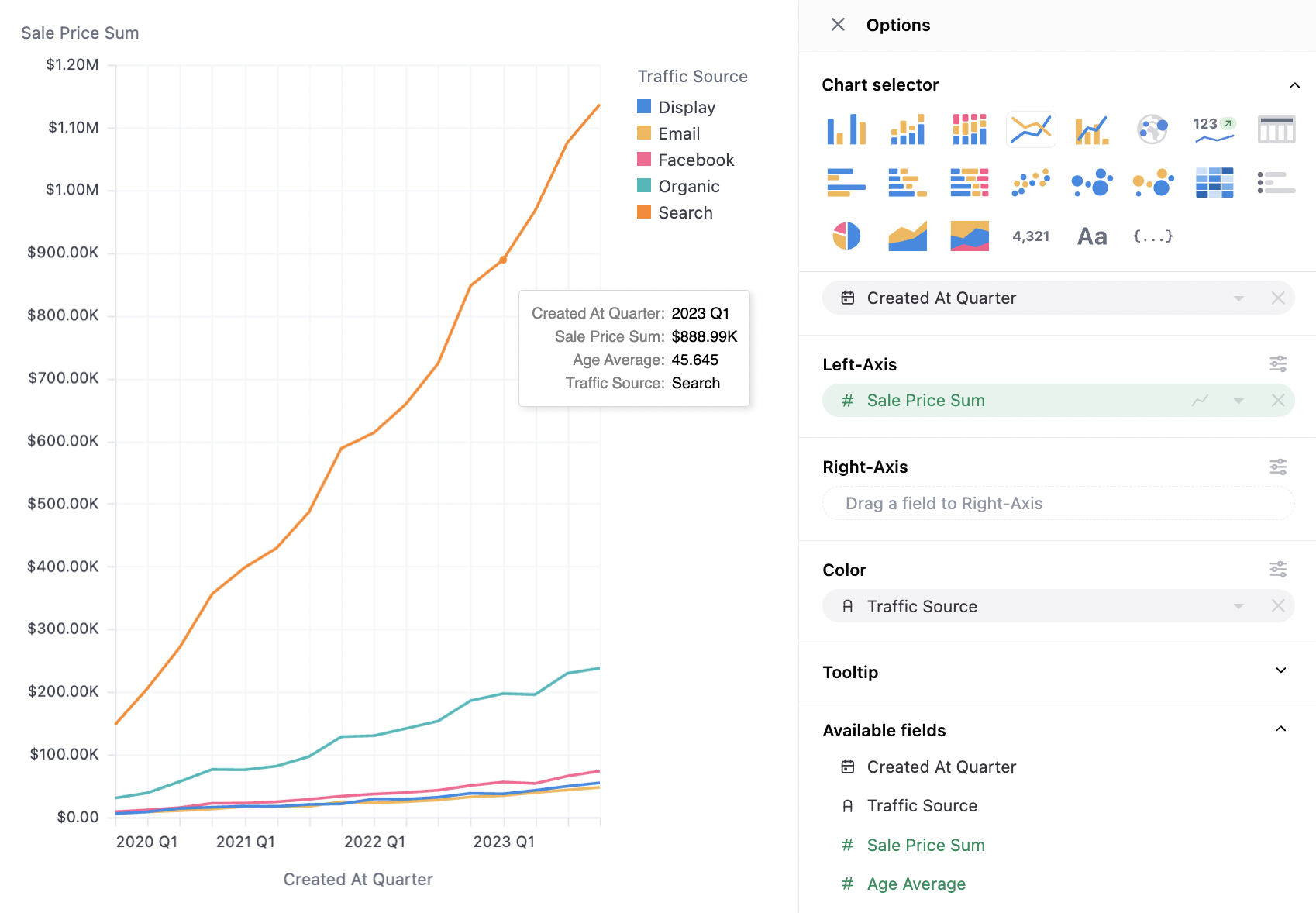 Here we map the dimension (Traffic Source) into our series (Sales Price Average), note `Traffic source is also on color here, hence the legend, but that is not required:
