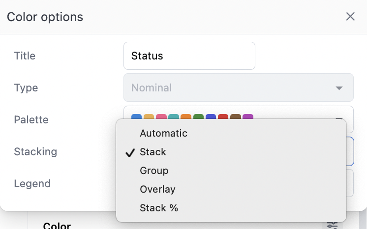 - Stack %: Series rebased to 100% across each x-axis value